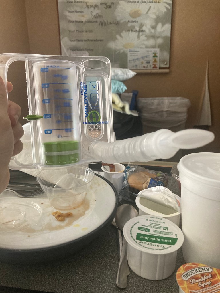 They gave me another lung strengthening tool. I guess this past week at home I may not have been using this as much. Why oh why did the blood have to hurt me so much? It seems so odd that old blood will do that? So weird. I am “glad” they got this done (not quite exactly thrilled to be back in the hospital, but being able to breathe better is not so bad?).