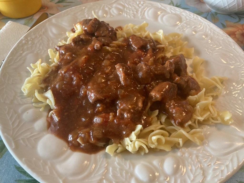There’s very few true joys in life, I feel like I can participate in these days. Sleeps hard, getting up I need my mom to help me out of bed, bathing I do with a bucket. So the one simple pleasure I get to indulge in, is eating! Boy, do I love this goulash that my mom makes. I don’t know what the cut of meat is, what the gravy is, or what. It’s just so gosh darn delicious! These egg noodles really soak up the flavors of the gravy, and the paprika really gives it a nice kick! I know that people across America call a dish ‘goulash’ that isn’t quite exactly real goulash. But this right here, this is the real deal.