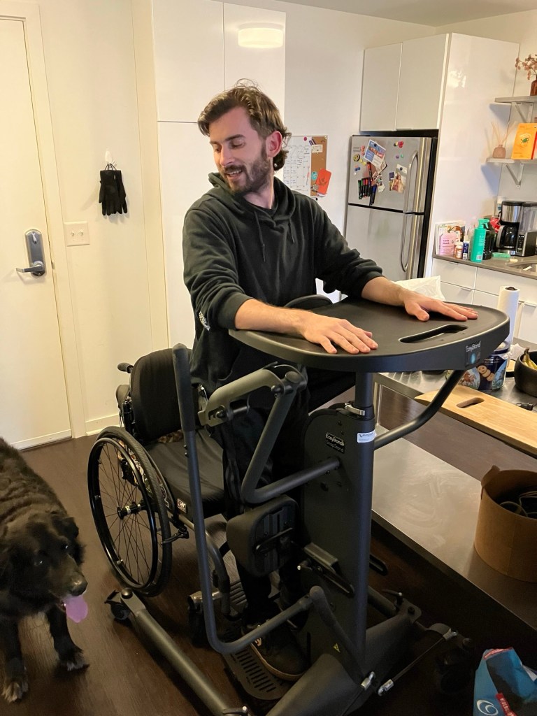 The next device I wanted to highlight is the Standing Frame. This has been a staple in my recovery journey now at home and at work. This allows me to get up into a standing position, load my bones and joints, and also work the muscles needed for weight bearing. I am currently working on being in the standing frame for 1hr 40min+ now, in addition to my work out and exercise daily routines.